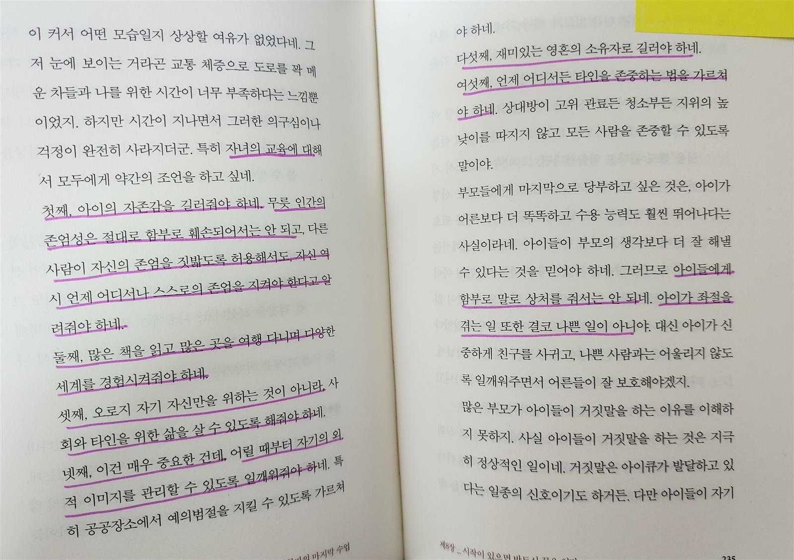 자녀 교육에 대한 조언 역시 의미 깊다. 핵심은 성취를 강요하지 말라고 알려준다. 아이가 스스로를 존중할 수 있는 자존감을 기르고, 사회와 타인을 향한 책임과 연대를 배울 수 있도록 돕는 데 있다는 것이다. 이는 개인의 성공을 넘어 공동체적 인간으로 성장하는 길을 제시한다.