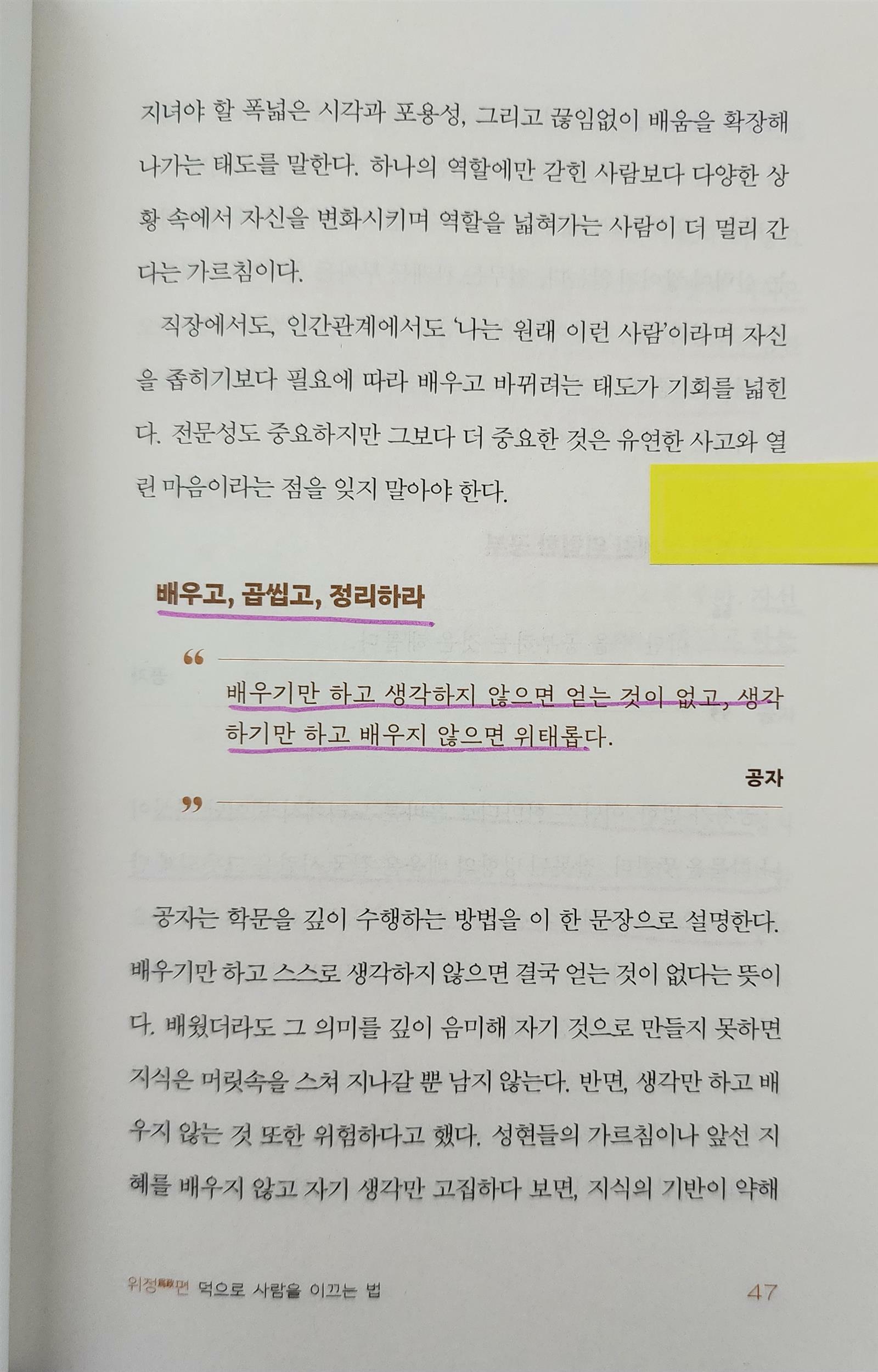 <"배우기만 하고 생각하지 않으면 얻는 것이 없고, 생각하기만 하고 배우지 않으면 위태롭다."