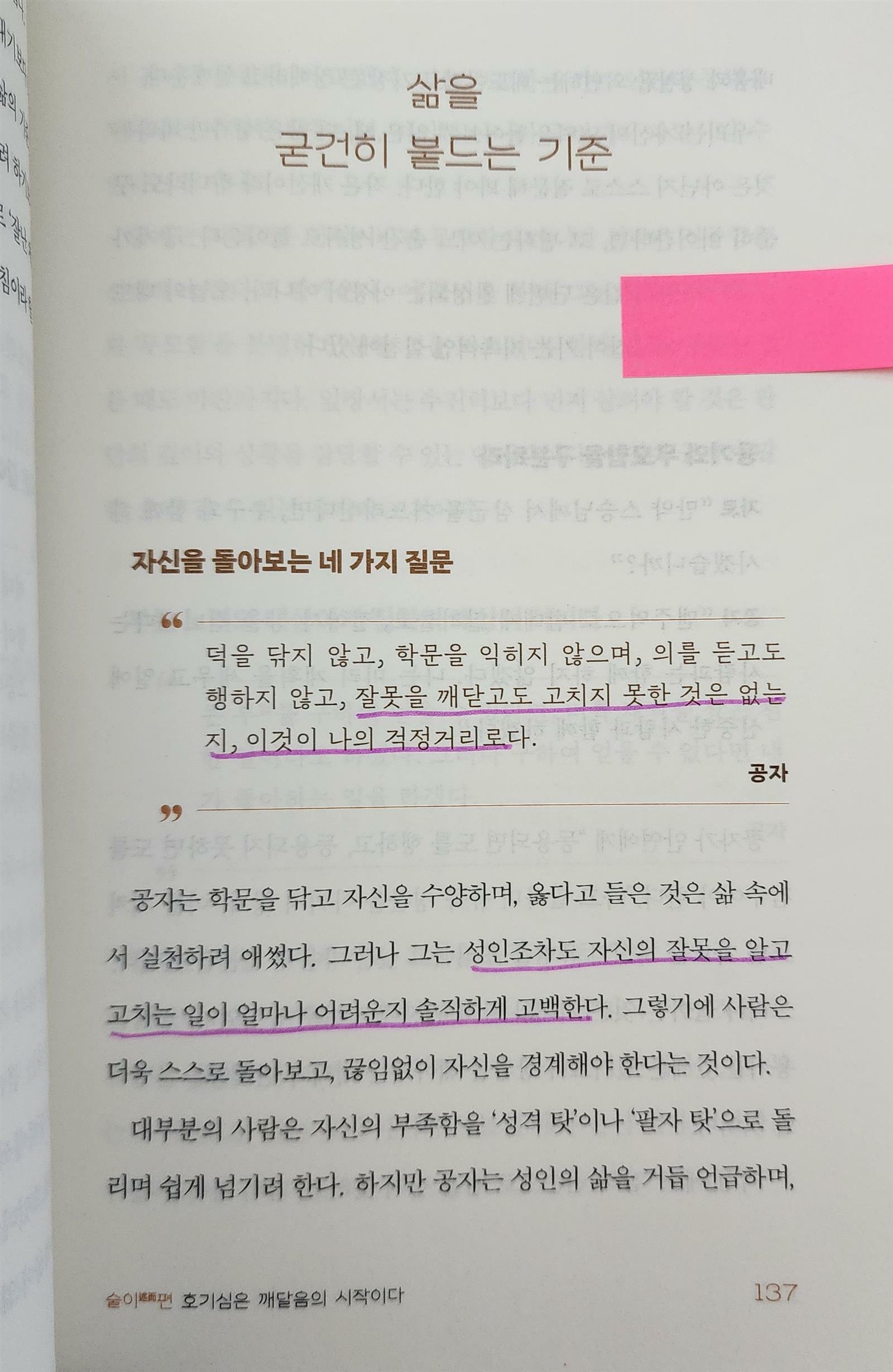 <자신을 돌아보는 네 가지 질문, "덕을 닦지 않고, 학문을 익히지 않으며, 의를 듣고도 행하지 않고, 잘못을 깨닫고도 고치지 못한 것은 없는지, 이것이 나의 걱정거리로다." 책 137쪽>