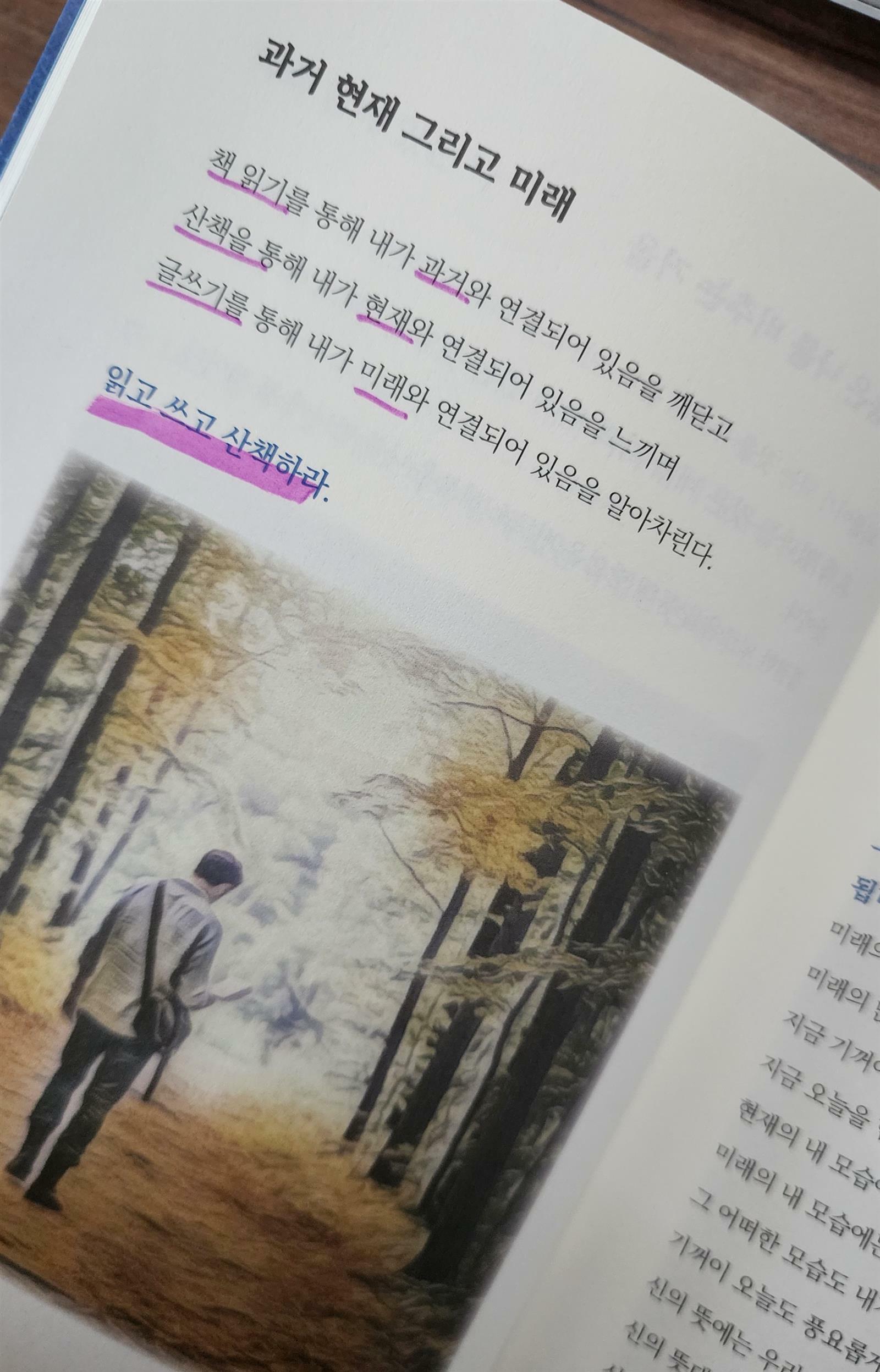 <"읽고 쓰고 산책하라. 책 읽기를 통해 내가 과거와 연결되어 있음을 깨닫고, 산책을 통해 내가 현재와 연결되어 있음을 느끼며, 글쓰기를 통해 내가 미래와 연결되어 있음을 알아차린다."