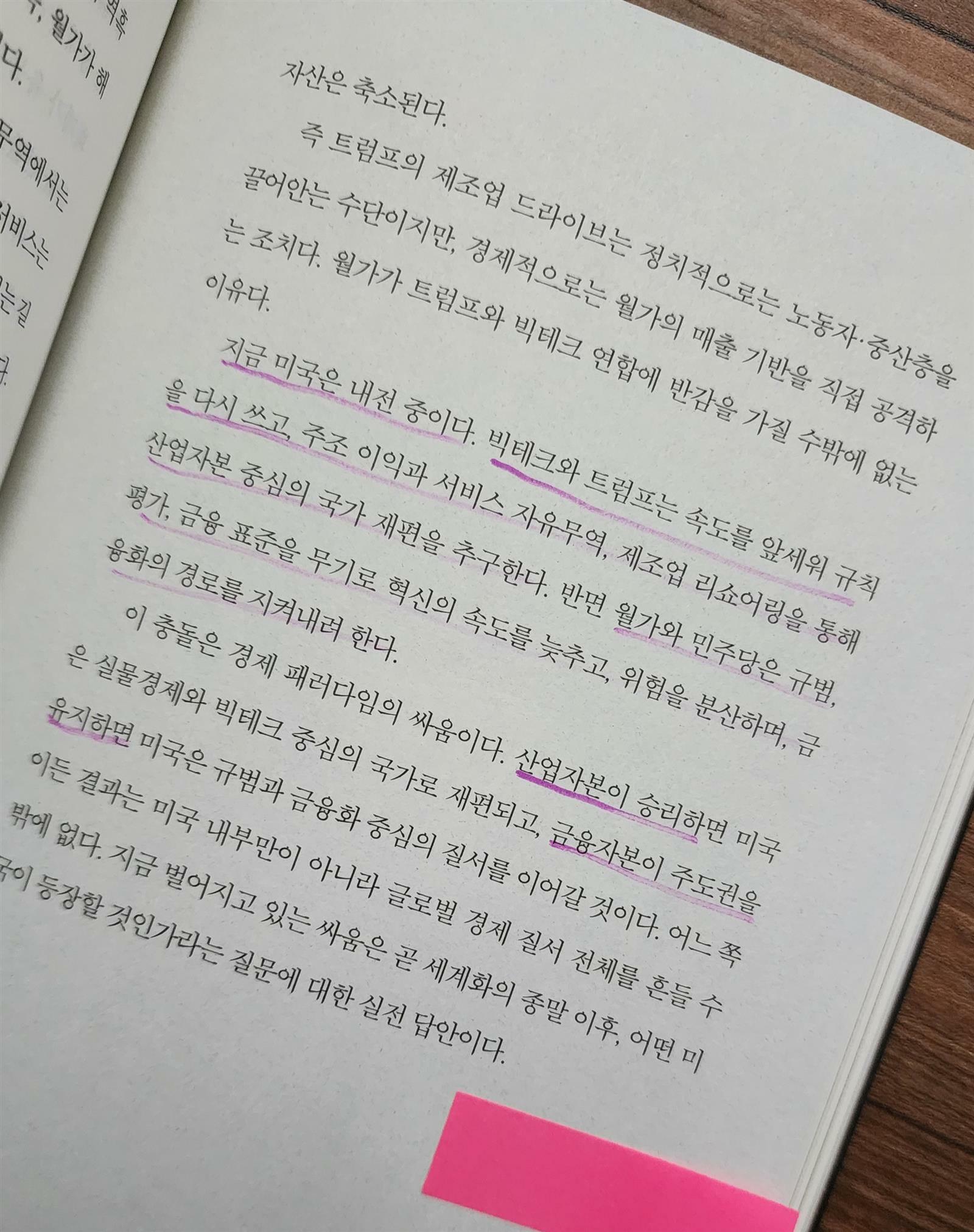 <"빅테크와 트럼프는 속도를 앞세워 규칙을 다시 쓰고, 주조 이익과 서비스 자유무역, 제조업 리쇼어링을 통해 산업자본 중심의 국가 재편을 추구한다. 반면 월가와 민주당은 규범, 평가, 금융 표준을 무기로 혁신의 속도를 늦추고, 위험을 분산하며, 금융화의 경로를 지켜내려 한다." 책 247쪽>