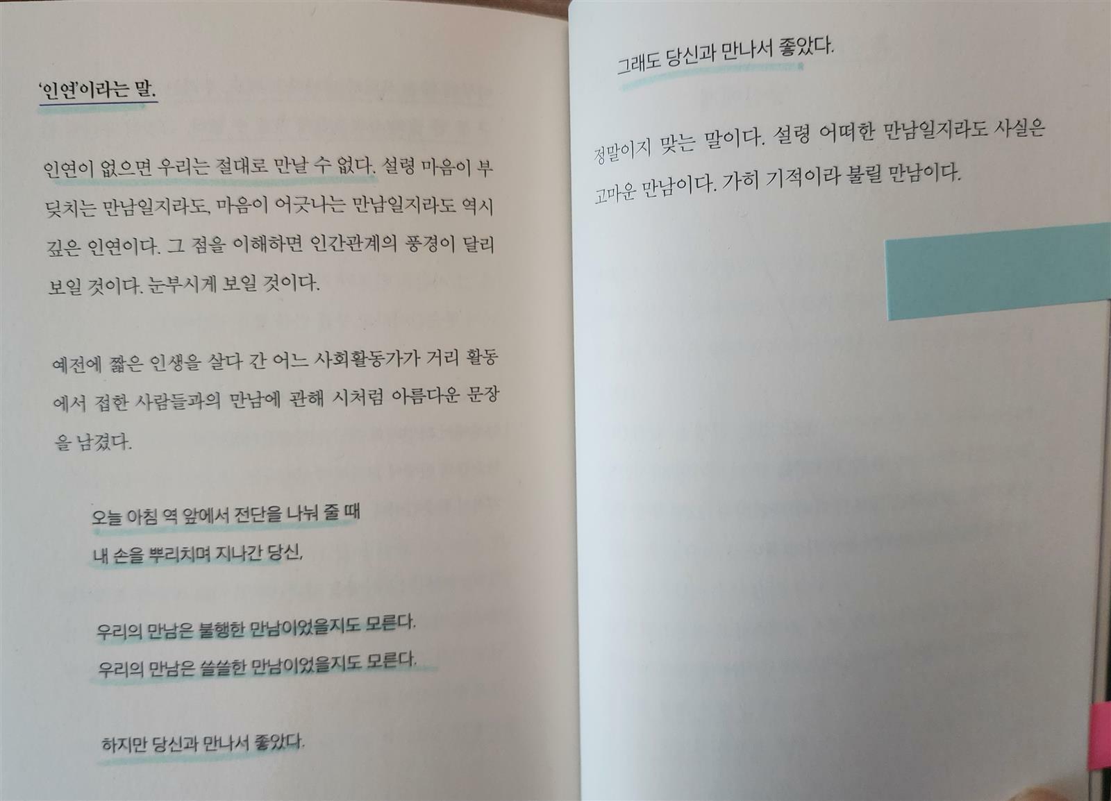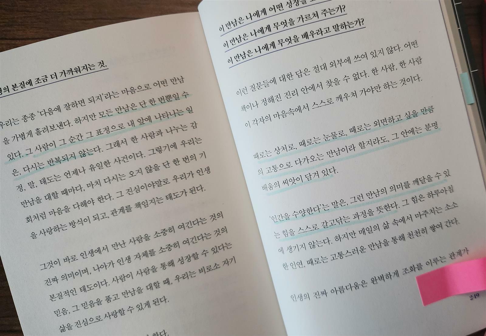 <"때로는 상처로, 때로는 눈물로, 때로는 외면하고 싶을 만큼의 고통으로 다가오는 만남이라 할지라도, 그 안에는 분명 배움의 씨앗이 담겨 있다." 책 249쪽>