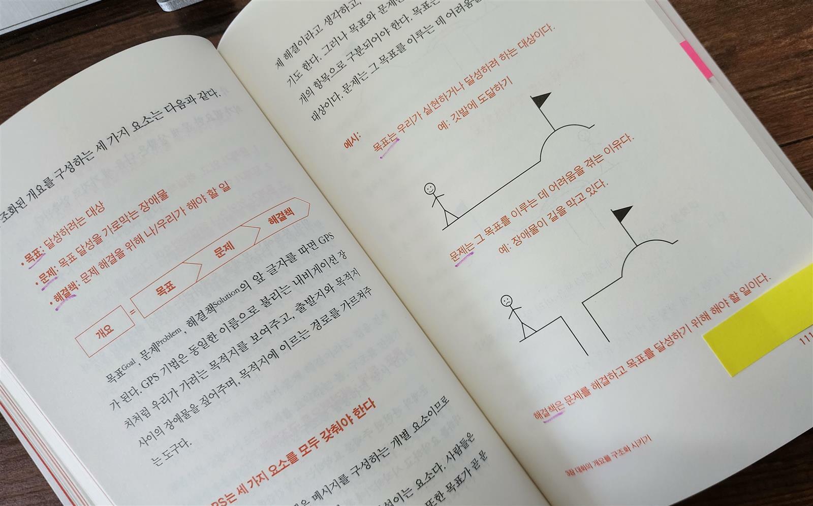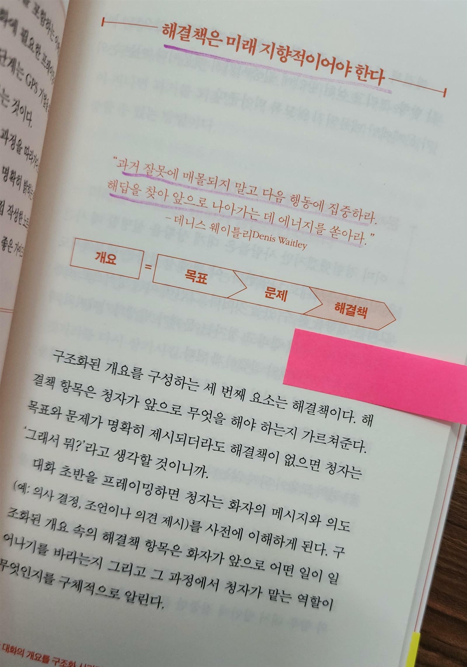 특히 인상적인 부분은 대화를 구조화하는 구체적인 해법이다. 저자는 복잡한 커뮤니케이션 이론 대신 누구나 바로 적용할 수 있는 틀을 제안한다. 바로 ‘목표–문제–해결책’ 구조다.