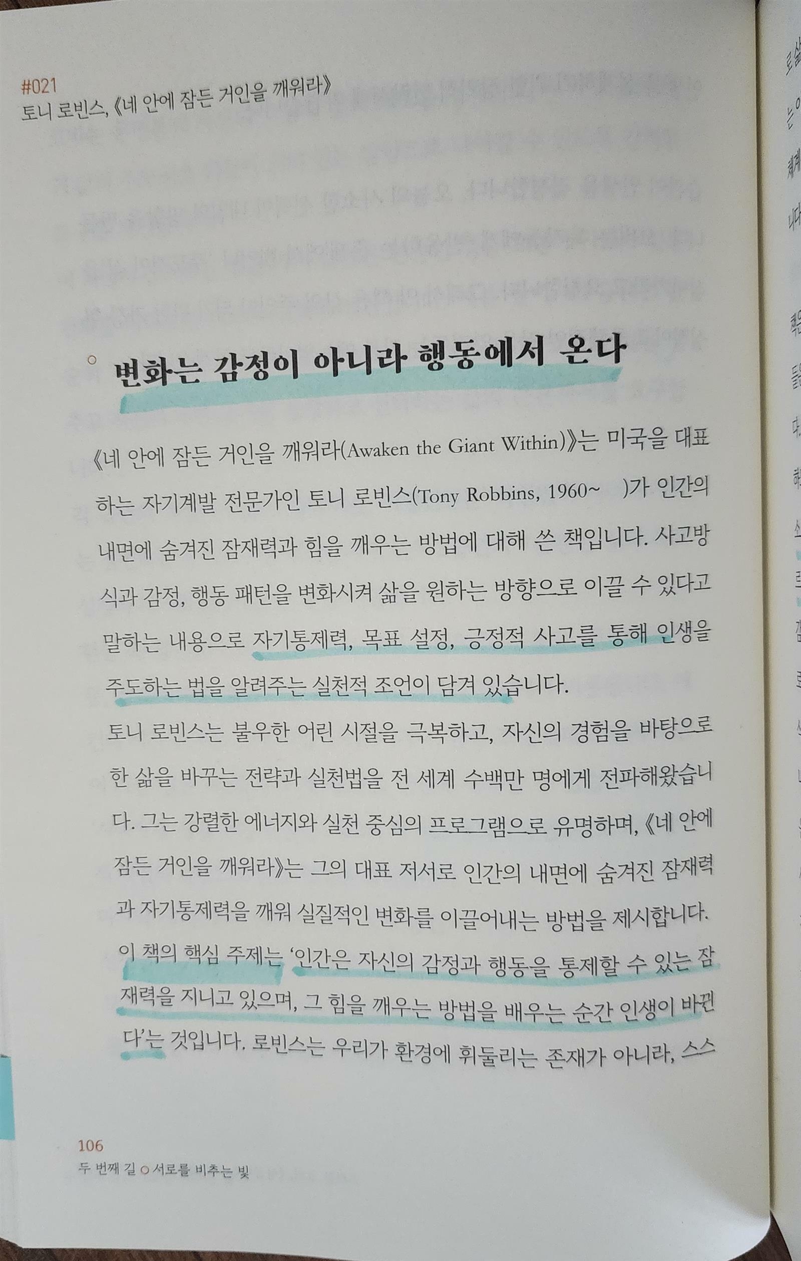 <변화는 감정이 아니라 행동에서 온다. "인간은 자신의 감정과 행동을 통제할 수 있는 잠재력을 지니고 있으며, 그 힘을 깨우는 방법을 배우는 순간 인생이 바뀐다." 네 안에 잠든 거인을 깨워라, 토니 로빈스106>