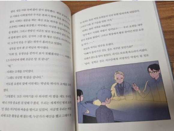 괴한들이 노리는 것은 바로 아빠의 usb 였는데. 아빠의 usb는 아빠가 다희에게 준 지구본모양의 핸드폰고리 안에 있는 usb 였다는 것을 알고 다희는 usb를 사수하기 위해 도망치다 아빠친구인 이도필 요원의 도움을 받아 1.5 사수단에 가게 된다. 다희는 1.5 사수단에 가서 아빠가 그동안에 1.5사수단의 요원으로써 활동했다는 사실에 큰 충격을 받게 되고 다희는 아빠에 이어서 1.5사수단에서 저승에서 온 김산호와 함께 활동하게 된답니다. 1.5사수단에 온 첫날부터 킬러제이의 피습을 받아 아빠의 동료 이도필요원과 박남욱박사가 미끼가 되어 검은 지구단엑 잡히게 되고 살아남은 다희와 김산호는 아빠의 usb를 들고 도망치게 되고, 박남욱박사의 누나인 박남숙박사 연구실로 가게 되는데 그곳에서 산호는 usb속에 있는 내용을 해독하게 되고 검은지구단의 음모를 알게 되는데요.. 과연 다희와 산호는 검은지구단의 음모로부터 지구를 구할 수 있을까요? 책을 읽는 내내 과연 뒷이야기가 어떻게 이어질지 너무 궁금하였답니다. 언제 어떻게 죽어서 저승에 왔는지 어떻게 저승 차사가 되었는지 아무도 모르는 산호.. 과연 산호는 누구였을까요?
