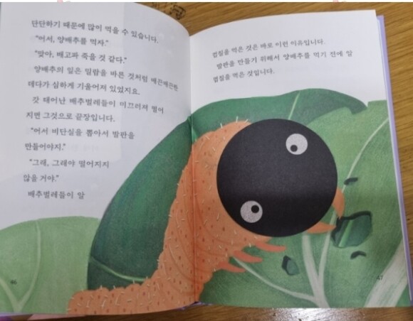 알들은 애벌레가 되어 양배추를 먹으며 무럭무럭자라게 되지요. 그러다가 배추벌레는 네번 허물을 벗으며 무럭무럭 자라게 되지요.