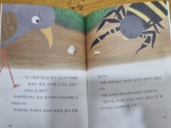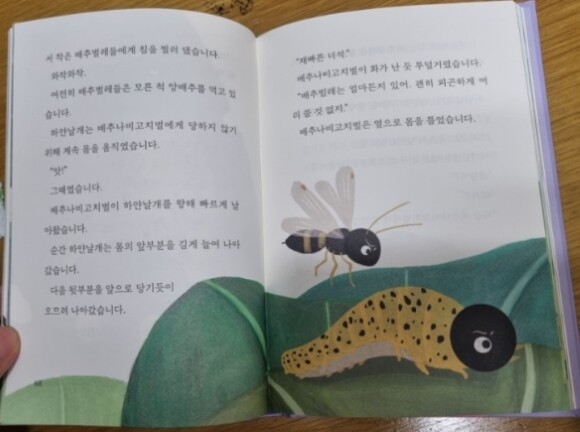 배추나비고치벌이 날아와서 양배추를 먹고있는 배추벌레들에게 침을 찔러 배추벌레속에 알을 낳았답니다. 하얀날개는 엄마가 했던 말을 기억하고 친구들에게 배추나비고치벌을 가까이 하면 안된다고 말했는데 작은 배추벌레들은 먹는 데만 정신이 팔려 있었네요 ㅠㅠ