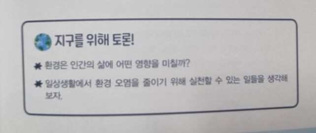 그리고, "지구를 위해 토론" 에 나오는 질문에 답을 생각하면서 자기위 미래와 자신의 미래를 생각해볼 수 있는 시간을 가질 수 있어요.