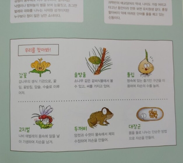 이 책의 핵심단어들은 감꽃, 솔방울, 튤립, 고치벌, 두꺼비, 대장균 이랍니다.