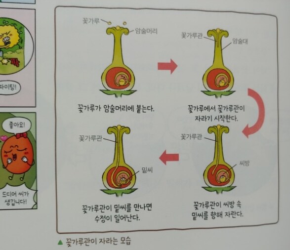 꽃가루가 암술머리에 붙어서 꽃가루관이 자라 씨방속의 밑씨와 만나 수정이 이루어져서
