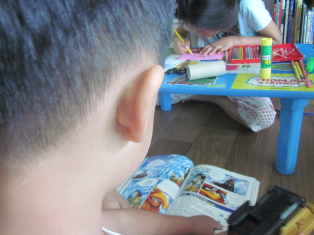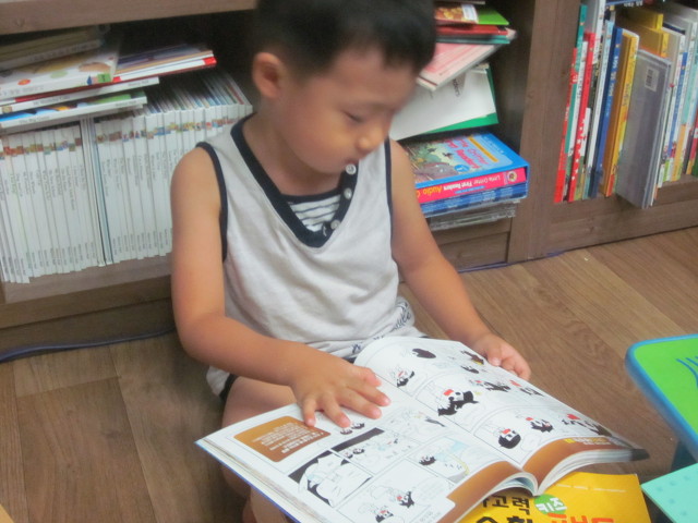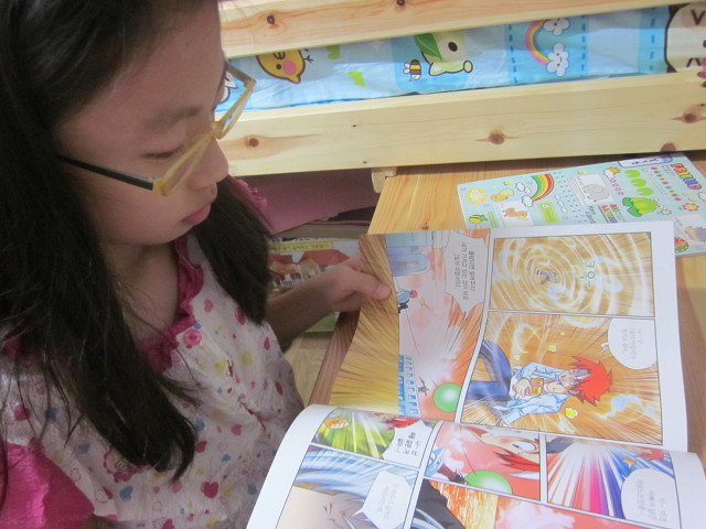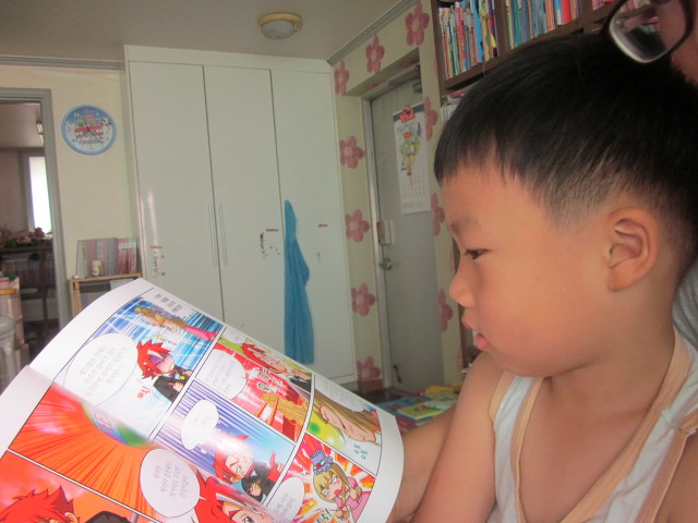 누나가 보는 만화책이라고 읽어달라고 하더니 혼자서도 저렇게 잘 봅니다.