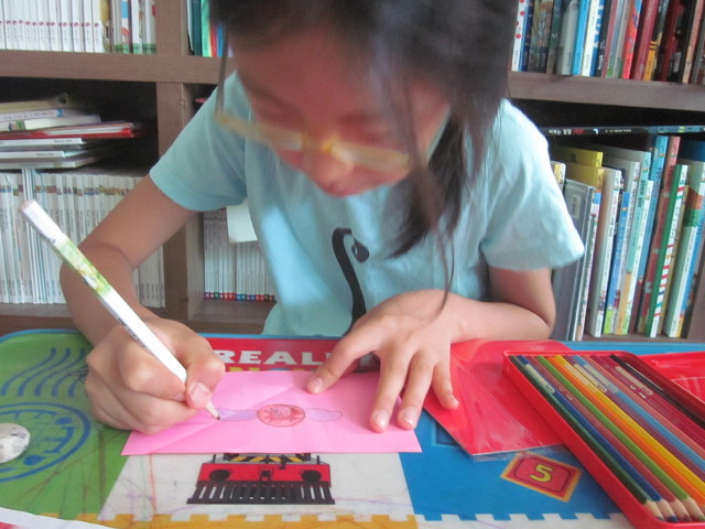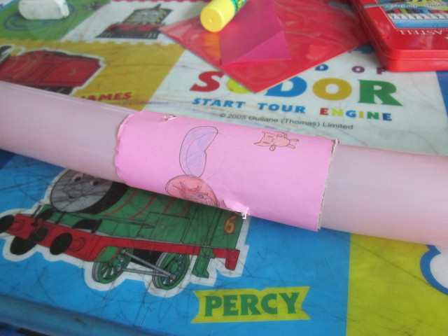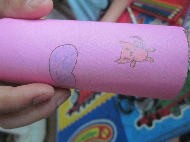 다음 휴지심을 꾸미기 위해 색종이에 그림을 그려넣네요.