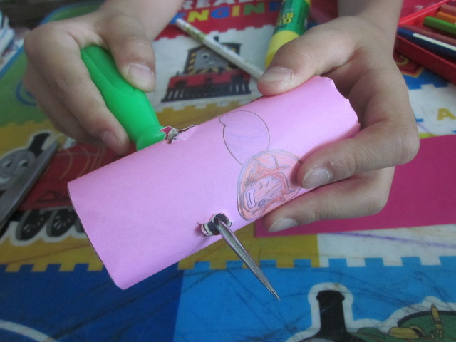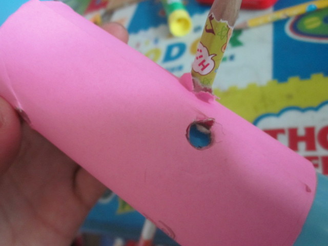 휴지심을 꾸미고 연필이 들어갈 자리를 송곳으로 네 군데 구멍을 뚫었어요.