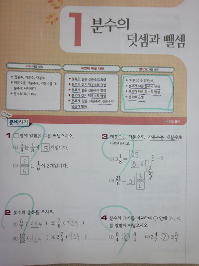 1단원 분수의 덧셈과 뺄셈 부분의 구성을 통해