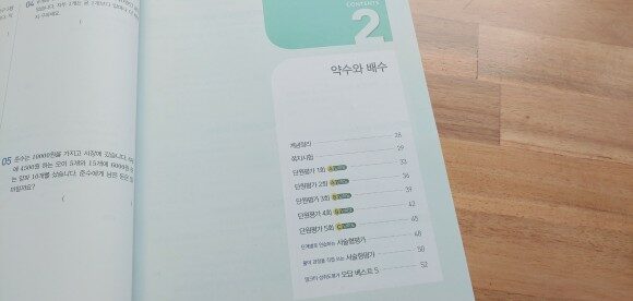 5학년 1학기 수학은 자연수의 혼합계산, 약수와 배수, 규칙과 대응, 약분과 통분, 분수의 덧셈과 뺄셈, 다각형의 둘레와 넓이까지 4학년까지와는 다른 제대로 된 수학이 시작되는 느낌입니다. 그래서 5학년부터는 수학에 더 신경쓰게 되는것 같아요.