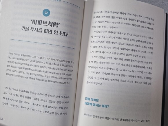 책에서는 건물을 살 때는 고려해야 할 조건이 많이 있다고 합니다. 이 중 하나라라도 소홀히 하면 투자에 따른 성공을 장담하기 어렵다고 하는데요. 그래서 건물주가 되려면 첫째도 둘째도 계획이라고 합니다. 철저한 계획인 전제되어야 하는 것은 물론, 관련 내용에 대해 전문가 수준이 되어야 합니다. 건물 투자를 결심했다면 가장 먼저 할 링은 계획을 세우는 것입니다. 자금은 어떻게 조달할 것인지, 어느 지역의 건물을 매입할 것인지, 어떤 목적으로 사용할 것인지, 어떻게 관리할 것인지, 매각은 언제 할 것인지 등 최대한 구체적이고 꼼꼼하게 세워야 합니다. 계획도 없이 아파트에 투자하듯, 오르면 팔고 떨어지면 보유하겠다는 생각으로 접근하면 감당해야 할 리스크가 너무 많다는 것입니다.