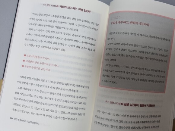 앞의 1부를 읽다 보면 기존의 내가 가지고 있었던 잘못된 생각에 관해서 확 바꿔주는 이야기들을 경험할 수 있었던 거 같습니다. 물론 이런 이야기들을 읽고 바로 받아들이고 고치기는 힘들 수도 있겠지만, 그럼에도 불구하고 내가 잘못된 생각을 하고 있었다는 것을 1부를 읽는 내내 느낄 수 있었습니다. <뜨겁게 투자하고 차갑게 승부하라> 2부에서는 나만의 투자철학을 세우는 이야기를 해주고 있습니다. 잘못된 투자습관을 2부에서 고칠 수 있을 거 같습니다.
