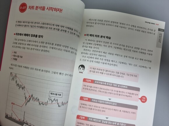 이 책의 내용이 주식 공부의 전부는 아닙니다. 또한 이 책이 7일로 공부할 수 있도록 구성이 되어 있지만, 7일 만에 공부를 끝낸다는 것도 말이 되지 않을 것입니다. 이 책을 읽은 후 증권사의 차트 툴을 이용하는 등의 방법으로 지식을 실전에서 활용하는 기술로 바꾸기 위해 노력은 해야 합니다. 하지만 <7일 마스터 주식 차트>는 지식의 기초를 쌓는데 확실히 도움이 된다는 것은 책을 완독 한 독자로써 정말 말씀드리고 싶습니다. 또 주식을 시작하기 전에 이 책을 만났다면 더 좋았겠다는 생각도 듭니다.