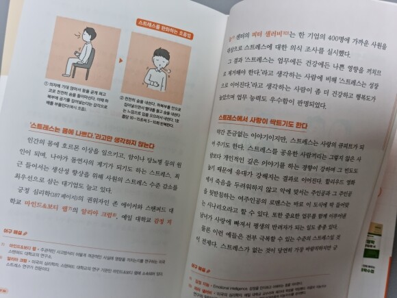 그리고 스트레스에 자신이 놓인 상황이라면 상황을 냉정하게 판단하고, 만약 곤란한 상황에 직면했다면 깊이 들어가지 말고 자신이 할 수 없는 일은 할 수 없다고 인정한 다음 신뢰할 수 있는 사람에게 도움을 구하는 것이 중요하다고 합니다. 이외에 스트레스 상황에는 과호흡 상태가 됨으로 심호흡을 통해 어디에서나 심신을 가다듬을 필요도 있습니다. 약간 뜬금없는 이야기이지만, 스트레스는 사랑이 큐피드가 되기도 한다고 합니다. 스트레스를 공유한 사람끼리는 그렇지 않은 사람보다 개인적인 깊은 이야기를 하는 경향이 강하며 그 빈도도 높기 때문에 유대가 강해지는 결과로 이어진다는 것입니다.
