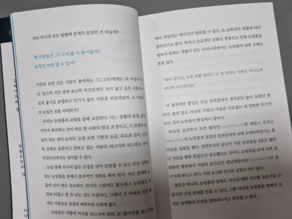 이 책은 크게 3가지 파트로 나눠져 있는데요. 1부는 몸짓에 관해서, 2부는 말에 관해서, 3부는 관계에서 관해서 이야기를 하고 있습니다. 우선 1부의 몸짓에 관해서 이야기를 하려고 합니다. 누군가와 이야기를 하기 전까지는 그 사람에 관해서 알 수 있는 방법은 그 사람이 하는 행동 하나하나 일수밖에 없는데요. 그 사람의 사소한 행동들을 통해서 내 마음을 오픈하고 말을 하거나, 내 마음을 닫아 놓고 이야기를 할 수도 있습니다