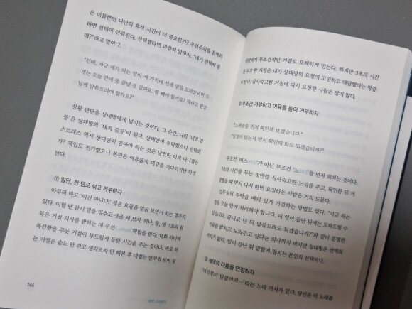 책의 마지막 파트는 관계에 대한 이야기입니다. 사람은 감정을 가지고 있는 동물이기 때문에 어떤 사람은 특정한 사람의 행동이나 말투에 불쾌함을 느끼지 않지만, 어떤 사람은 그 사람의 행동이나 말투에 큰 불쾌함을 느낍니다. 사람마다 느껴지는 감정의 폭이나 생각, 가치관 등이 다른 것입니다. 그렇다고 이런 관계가 모두 복불복처럼 사람마다 다르니 포기하자는 식으로 가도 안될 것입니다.