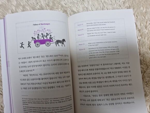 책의 초반에 나오는 연역적 논증, 귀납적 논증에 관해서 배워가면서 학교에서 배웠던 것들이 자연스레 생각나는 시점에 어느 순간 책에 빠져들면서 재밌게 읽는 저를 발견했는데요. 다양한 논리적인 오류들을 보면서 일상생활에서도 저도 유사한 오류에 빠지는 것은 아닌지라며 비교하는 재미가 쏠쏠했던 거 같습니다.