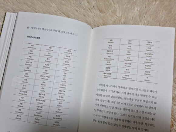 웰씽킹 책에는 정말 실질적으로 실천해보면 좋을 거 같은 내용들이 많이 나옵니다. 저는 그중에서 조금 인상 깊게 읽었던 대목은 나의 핵심가치를 찾아내는 부분이었습니다. 오랜 세월을 살아왔다고 얘기하기 어중간하지만, 지금까지 나만의 가치가 무엇인지 잘 알지 못했던 거 같습니다. 그렇다 보니깐 중요한 순간에 중요한 선택을 해야 할 때 기준이 없어서 제대로 선택하지 못했던 적이 많이 있습니다. 혹은 저만의 핵심가치를 없어서 방향성을 잃었던 기억도 많이 있는 거 같습니다.