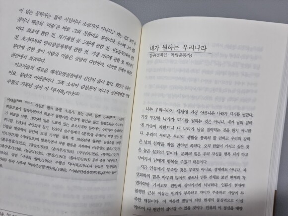 그중에서 독립운동에 있어서 가장 대표적인 분이신 김구 선생님이 쓰신 '내가 원하는 우리나라'가 실려 있습니다.