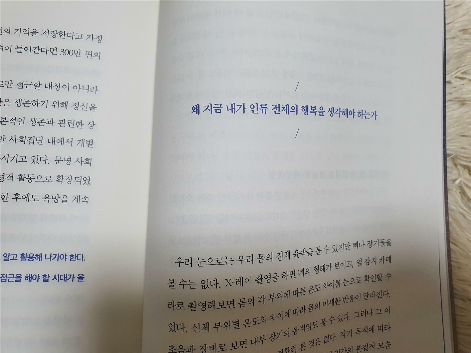 다양한 철학책을 많이 읽어보지는 못했지만, 역시 철학은 읽는 것으로만 끝나는 것이 아니라 스스로 생각하는 시간이 많이 필요하다는 것을 이번 책을 읽으며 더 느끼게 되었습니다. 어찌 보면 삼성이라는 기업명에 이끌려 이 책을 읽기 시작해서 삼성에 관한 내용이 많이 없어서 조금 실망도 하기는 했지만, 삼성이라는 것보다 인류의 미래에 고민을 더 많이 해준 이 책도 꽤 괜찮았다고 생각이 듭니다. 혹시라도 인류와 미래의 행복이라는 사색의 시간이 필요하다면 '삼성이 철학하는 이유' 책과 함께 시간을 보내보는 것도 좋을 거 같습니다.