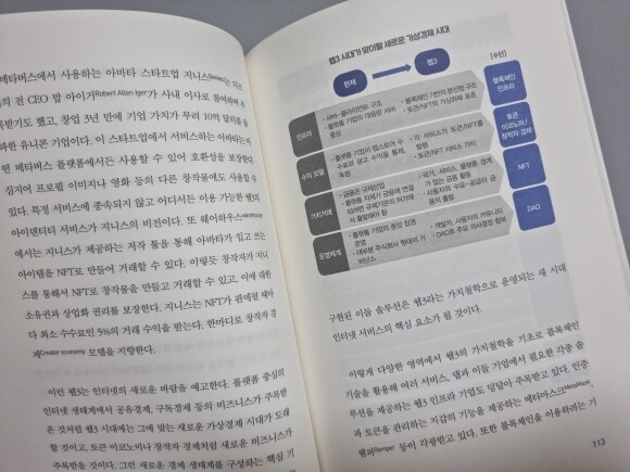 책을 읽는 내내 지금까지 알고 있었던 많은 메타버스, 블록체인, IoT, NFT와 같은 기술들에 관해서 다른 시각을 가지게 되었습니다. 단순히 아직까지 제대로 잡히지 않고, 허상으로만 보였던 기술들이 바로 앞으로 다가 올 미래라고 느껴지기도 했습니다. 특히 블록체인을 단순히 코인으로만 생각하고 느꼈다면 이 책을 통해서 블록체인이 기존의 웹 생태계를 바꿔줄 기술로써 생각하게 되었습니다. 잘못된 생각의 개념을 바로 잡아주는 책이라는 생각이 들었습니다.