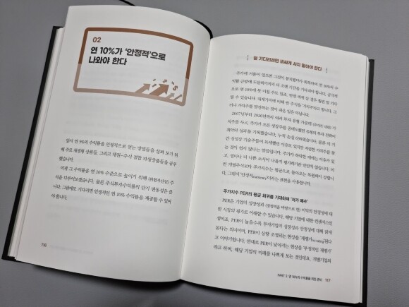 우선 책에서 소개하는 가장 간단한 방법은 비싸게 사지 말아야 한다는 것입니다. 주식투자를 하면서 가장 많이 들었던 이야기였던 저렴하게 사서 비싸게 팔아라라는 것입니다. 주가에 거품이 있으면 그것이 붕괴됐다가 회복하여 연 10%에 수익률 근방에 도달하기까지 더 오랜 기간을 기다려야 한다는 것입니다. 반면 싸게 살 경우 훨씬 덜 기다릴 수 있습니다. 내재가치에 비해 싼 주식을 '가치주'라고 합니다. 하지만 이 '가치주'를 발견하는 것이 쉬운 것은 아닙니다. 책에서는 비싸게 사지 않는 방법에 관해 다양한 이야기들을 풀어주고 있는데요. 제가 여기에서 설명을 하기에는 모든 것들을 제대로 소개할 수 없을 거란 생각도 들고, 투자에 관한 이야기이다 보니 조심스럽게 되네요. 하지만, 확실히 10%의 수익을 상세한 가이드를 제공하고 있어서 연 10% 정도의 수익률을 기대하는 분들이라면 도움을 얻을 수 있을 거 같습니다.