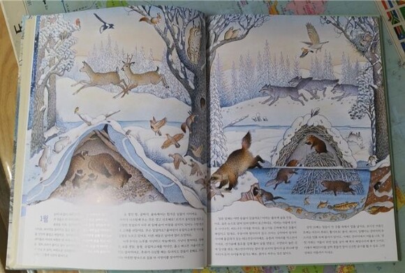 하루가 짧은 겨울...땅이 꽁꽁 얼고 눈이 숲과 벌판을 새하얗게 뒤덮어요. 숲속 동물들은 겨울철에 무엇을 먹을 수 을까요? 겨울잠을 자는 동물들이 보이지요. 눈밭을 뛰어다니며 먹이 사냥을 하는 동물들도 보이네요.
