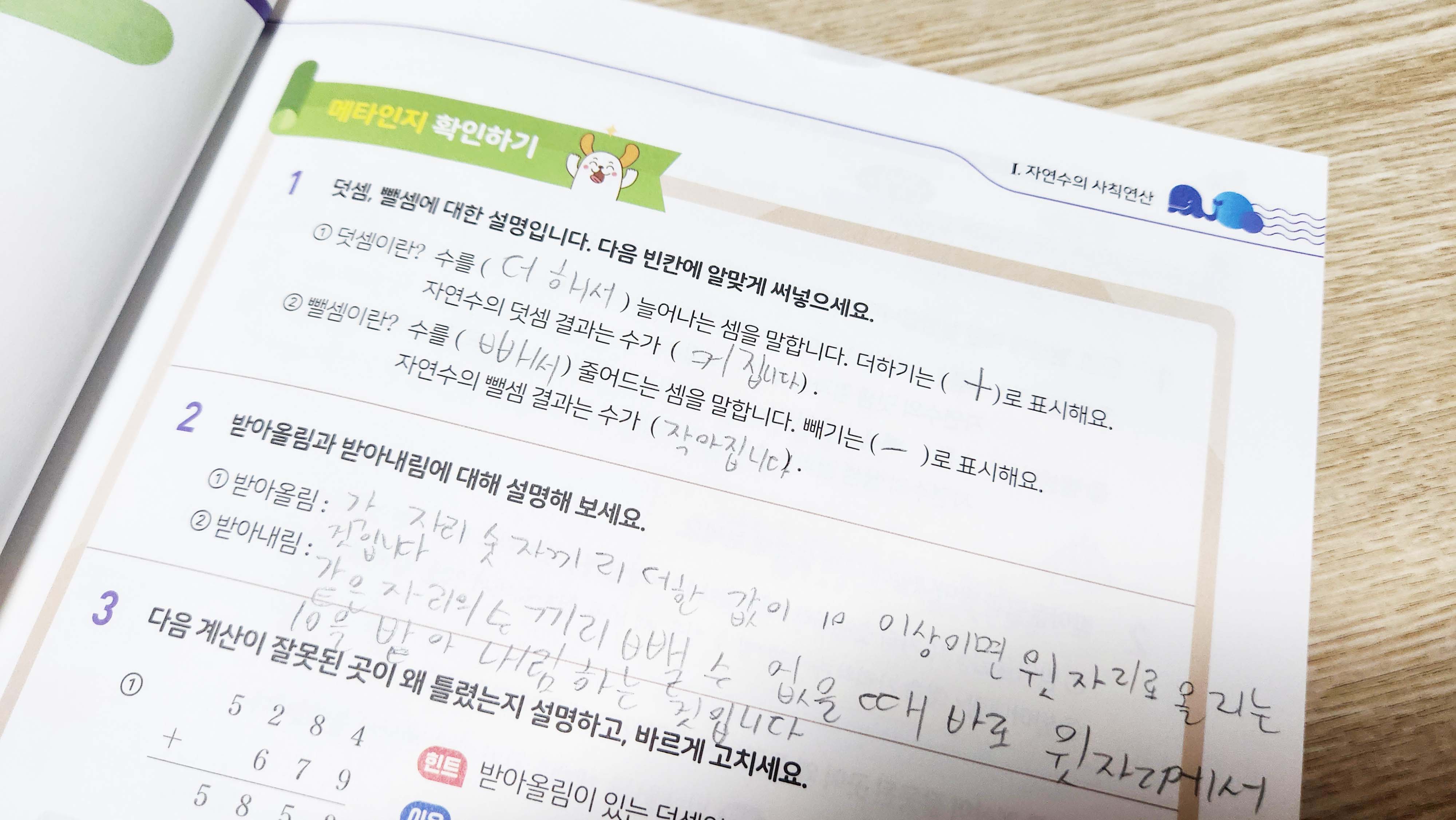 제일 좋은 건 이렇게 메타인지 확인하기 부분에서 설명할 수 있게 정리하는 부분이 있다는 거에요. 저는 쓰고 엄마에게 알려줘 라고 말하거든요. 따라 읽든 외워 읽든 어쨌든 쓰고 읽는 연습을 해서 해당 수학개념을 머릿속에 집어넣는거죠.