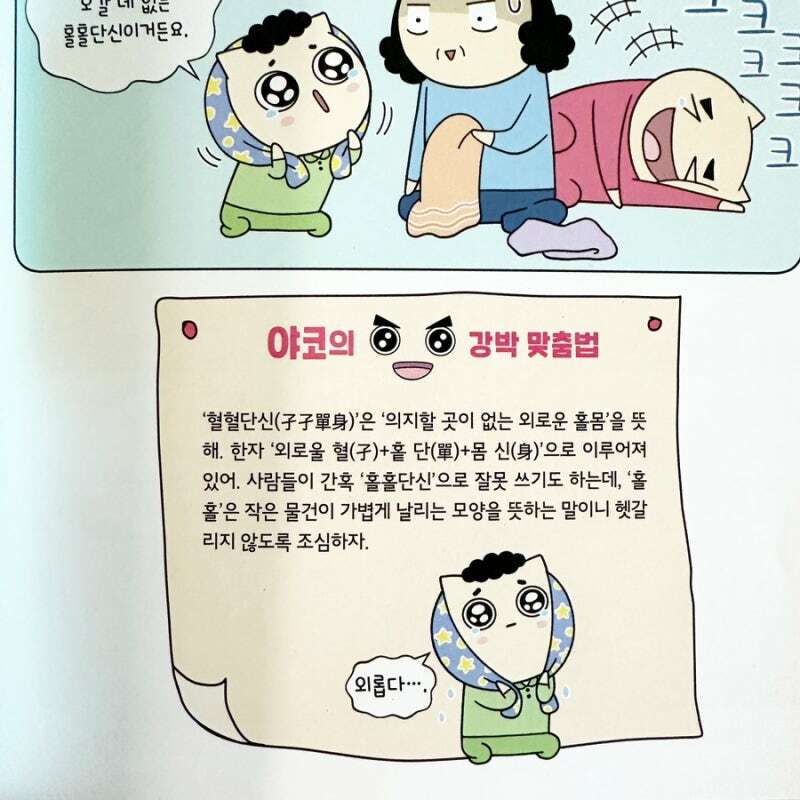109만구독자 중 한 명인 아이가 좋아하는 빨간내복야코가 잔뜩 나오는 빨간내복야코맞춤법절대안틀리는책 2권이에요 저학년이 보기 좋겠다 싶은 재미있는 맞춤법 책인데요 1권을 너무 재밌게 읽었고 또 수시로 보는 책이라 신간 소식 듣고 얼른 봤죠 맞춤법 외 띄어쓰기, 문장 부호도 함께 있어서 은근 헷갈렸던 부분들 아이와 함께 읽으며 어른도 체크하는 시간 가질 수 있어요 누적 조회수 500만 뷰 야코 노래도 수록되어 있으니 아이와 같이 들어보세요