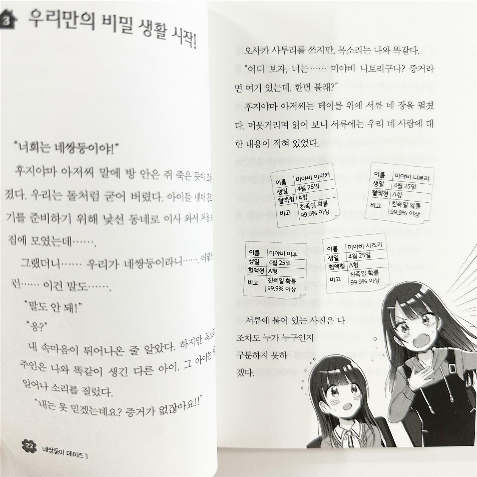 어린이책 총선거 아동 문고 부문 1위에 제6회 가도카와 츠바사 문고 소설상 특별상 수상했다는 #네쌍둥이데이즈 전천당보다 강력하다는 책 소개에 윤이와 읽어봐야겠다 싶어서 챙겨봤는데요 갑자기 나타난 나와 똑같이 생긴 3명이 나타났다면 어떤 기분일까요? 이 네 쌍둥이가 같이 살게 되고, 학교에 다니며 생활하는 모습, 함께 공감하고 지지하는 적당한 길이의 줄글 도서입니다 저학년 여자친구들이라면 재미있게 읽기 좋은 내용이에요 2권도 출간되어 있으니 마저 읽어봐야겠습니다 ⠀ #아울북 #네쌍둥이 #네쌍둥이데이즈 #초등도서추천 #초등문고 ⠀