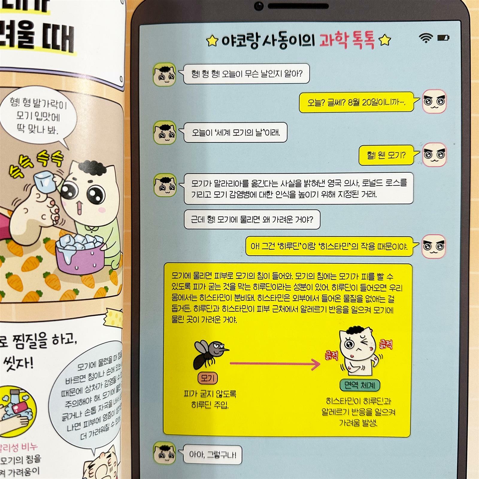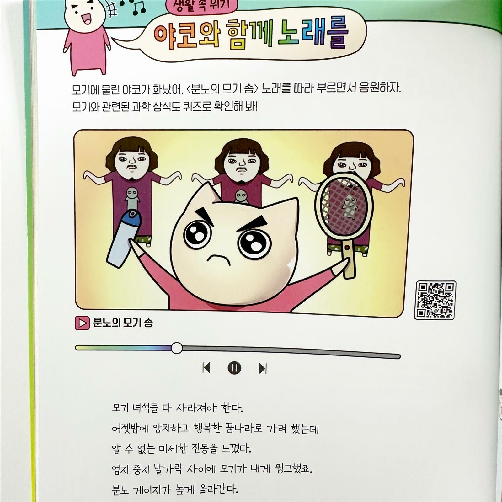 맞춤법 절대 안틀리는책도 여러번 반복해서 볼 정도로 좋아하는데, 이번에 야코 과학책이 나왔다니 정말 좋아하더라구요 차례만 훑어도 궁금증을 유발하는데요 어린이들이 일상에서 겪을 수 있는 30가지 위기 상황을 재미있는 만화로 담았다하니 아이들이 재밌게 읽습니다 실제 3학년부터 시작하는 과학 교과 연계가 되니 괜찮죠 QR코드로 생생히 들어볼 수 있는 야코와 함께 노래를 은 감초역할을 톡톡히 하고 있으니 챙겨 들어보시길 추천해요
