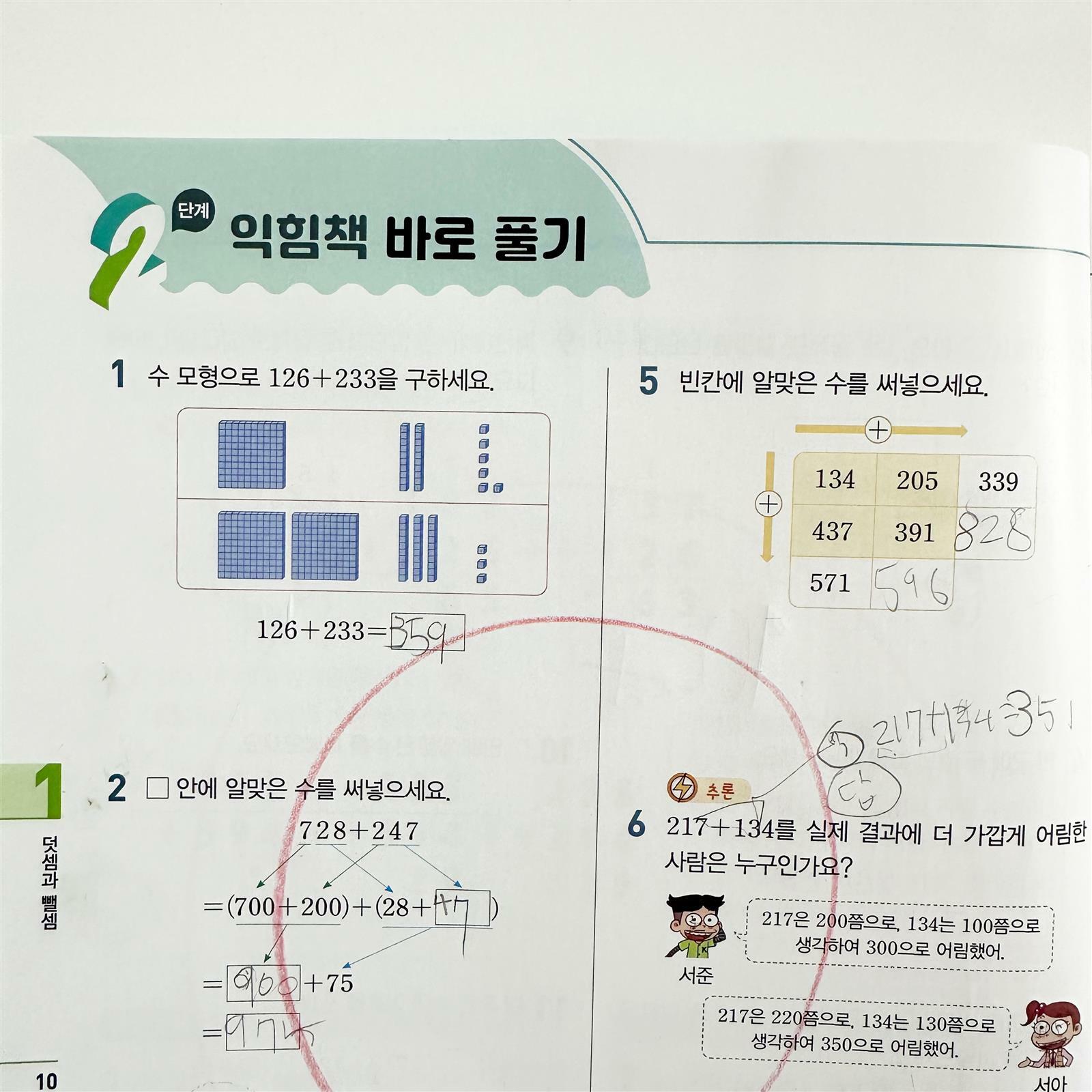 겨울방학을 위해 좋아하는 천재교육의 문제집을 받아보았는데요 수학리더기본 으로 이런 부분을 배우게 될 거라 훑고 가기에 좋아보였습니다 핵심 개념을 이해하고 나면 확인 문제와 한 번 더! 확인 문제를 지나고 나면 익힘책바로풀기 로 넘어갈 수 있는데요 기본 답게 문제집 난이도는 어렵지 않습니다 각 단원이 끝나면 책 뒷편의 단원평가와 수학 성취도 평가로 아이가 어느 정도 이해하고 있는지 확인할 수 있어요