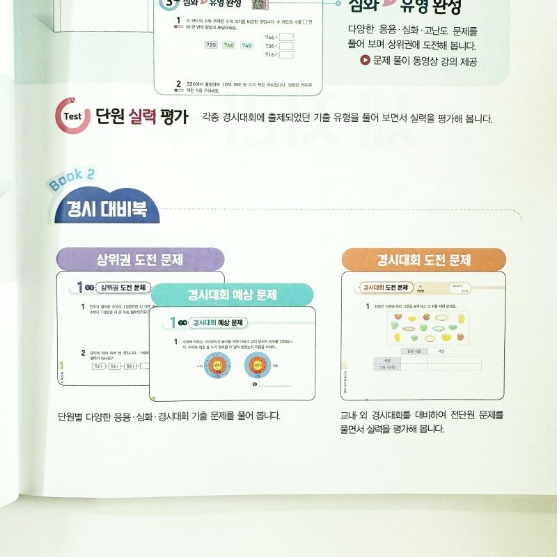 상위권 도약을 위한 응용심화서 수학리더응용심화 천재교육 수학리더 시리즈 중 초등 3~6학년에만 있는 최상위 교재를 제외하면 난이도가 제일 높은데요 핵심노트로 정리하고 기본유형 , 실력유형, 심화유형 단계별로 학습하며 아이가 취약한 부분을 알아볼 수 있었어요 뒤편 두번째 책은 경시 대비북으로 교내외 경시대회 대비 좀더 응용, 심화 문제를 풀어볼 수 있답니다