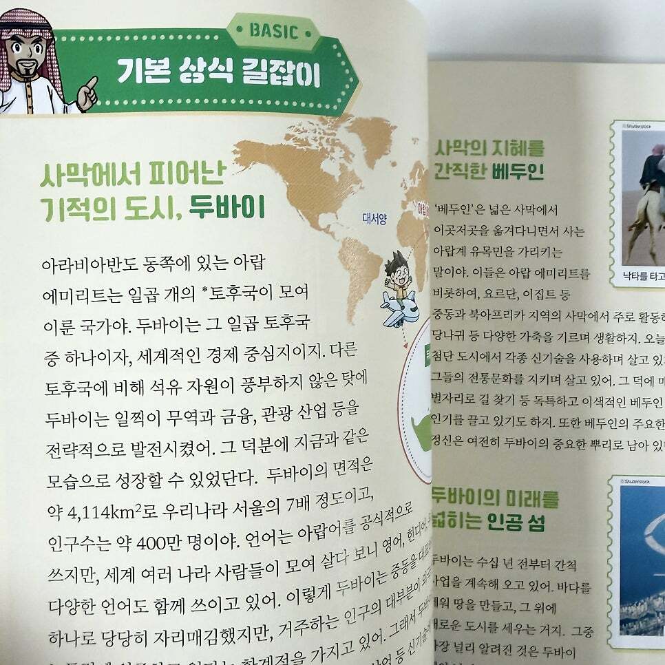 출판사로부터 도서를 제공받아 작성하였습니다 미래엔아이세움의 세계탐험 만화역사상식 중 31번째 #두바이에서보물찾기 입니다 두바이에 가보고 싶다 정도로 생각만 했었는데 사실 모르는 부분이 많았는데요 두바이 는 일곱 개 토후국이 모인 국가라 하는데요 아랍 에미리트에 위치하고 경제적으로 부유한 국가로 많이 알려져 있죠 저와 아이처럼 두바이에 대해 몰랐던 사람도 학습만화를 읽어가며 중간 중간 나오는 기본 상식 길잡이, 도시 여행 가이드 등 괜찮더라구요