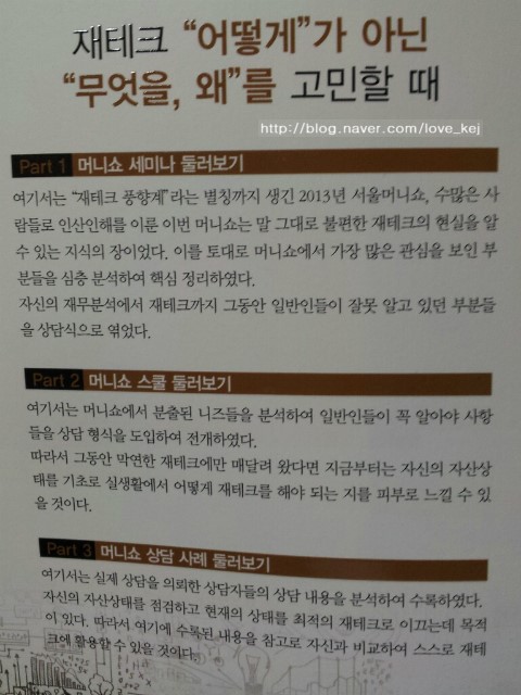 표지에 적힌 상담집이라는 글이 무색하게 상담 내용은 그리 많지 않았던 것 같다. 물론 예전에 내가 읽었던 책에 비해서는 풍부한 편이었으나, 예상한 만큼의 양은 아니었던 것 같다. 마지막 파트에 연령별, 세대별로 상담 내용을 다양하게 수록하고 있는데, 이 부분의 양이 조금 더 많았으면 좋지 않았을까 하는 생각이 든다. 하지만, 어느 특정 계층을 겨냥해서 쓰지 않고 최대한 다양한 계층들의 사례를 싣고자 했던 노력이 보기 참 좋았다. 읽는 독자들이 자신의 상황에 맞춰 사례들을 선택적으로 적용할 수 있는 폭이 넓다는 생각이 들었기 때문이다. 앞부분에 재테크와 관련된 정보들을 담고 있던 부분에서도 이해를 돕기 위한 상담 사례들이 짤막하게나마 제시되어 있었기 때문에 그 부분도 참고한다면 그 폭은 더 넓어질 수 있을 것이라는 생각이 든다.