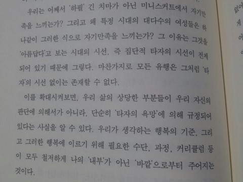 솔직히 이 part는 100% 흡수하지 못했다. 아무리 적다고 하나 생소한 철학자들의 이름과 사상의 개념 및 용어들은 기존의 나의 지식과는 배치되는 부분도 있고 같은 단어를 다른 의미로 사용하고 있기도해 혼란을 많이 느꼈기 때문이다. 하지만, 행복과 관련해 흔히 우리가 '자기 만족'이라 부르는 행위 밑에도 '타인의 시선'이 깔려 있으며 타인과의 비교를 통해 내적 우월감을 느낀다(p.133-134)고 했던 부분은 그동안 나의 만족을 위해 꾸미고, 내가 하고 싶어하기 때문에 한다던 공부가 사실은 타인의 시선을 의식해서 행해지는 가짜 자기 만족이 아니었을까 하는 생각이 들게 하면서 온전히 '나'를 이해하는데 많은 도움이 되었던 것 같다. 그동안 왜 주변에서 알아주지 않으면 그토록 나 자신이 힘이 들었는지 비로소 알 수 있게 된 것이다. 결국 내가 '행복'이라고 부르던 것들이 모두 진짜 나의 행복이 아니라 타인의 시선에서 규정된 남의 행복이었던 것이다. 그래서 그토록 난 내가 원하는 것을 하면서 살고 있다고 말은 하면서 행복함은 느끼지 못했던 것이다.