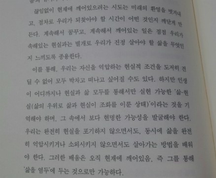 좋은책이었음에도 내 머리가 이를 따라가지 못해 너무 아쉬웠다. 이 책을 제대로 이해할 수 있으려면 생각하는 훈련을 많이 해야 될 것 같다. 논리적인 구성이 굉장히 돋보이고, 설명도 그렇게 어렵지는 않았던 책이었다. 다만, 집중해서 읽지 않으면 개념들이 혼동을 줘 나중에는 읽기가 버거워질 수도 있었던 책이기도 했기에 나와 같은 초보자가 마음 편히 읽을 수 있는 책은 아니었던 것 같다. 하지만, 삶에 대하여 많은 생각을 하게 해준다는 점에서 길을 잃고 방황하고 있는 사람들에게 권하고 싶은 책이다.