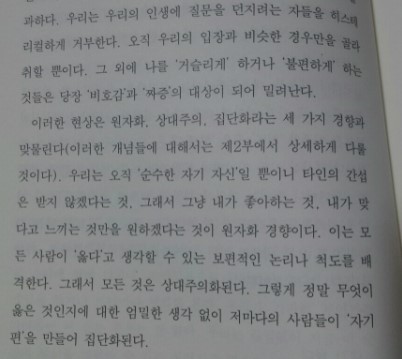 1부에서는 이외에도 청춘들의 방황을 대학의 문제라고 지적하기도 하고, 인생을 단순하게 살려고 하는 청춘들을 비판도 하고 있다. 단순성은 겸손을 가르치지 않는다고 오히려 오만함과 내가 옳다는 나르시즘을 남길뿐(p.41)이라고 말이다. 이 부분은 읽으면서 얼굴이 붉어졌던 부분이기도 했던 것 같다. 나 역시 타인의 말은 귀기울이지 않고 내가 원하는 것과 좋아하는 것만 찾아 다녔기 때문이다. '상대주의'라는 개념을 들먹이며 나와 다른 생각은 인정하는 척하면서 배척했던 것 같다. 반성하고 또 반성하는 부분이다. 보편적인 기준들을 세우고 상대주의의 입장을 견지하고 있어야 하는데, 나는 그러지 못했던 것 같다. 앞으로는 나만 옳다는 생각도, 다른 사람의 말에 귀를 기울이지 않는 오만함도 버리도록 노력해야 겠다.