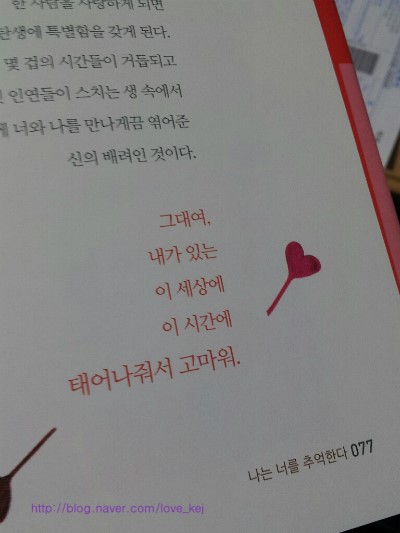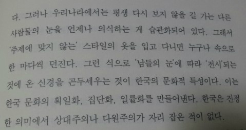 타인의 시선에 너무 신경을 쓰고, 조금만 튀어도 큰 일이 나는 줄 아는 나에게 나 스스로 하고 싶은 말이라 남겨 본다. 나는 나대로, 다른 사람은 다른 사람대로 달라서 아름답다는 사실을 잊지 말자.
