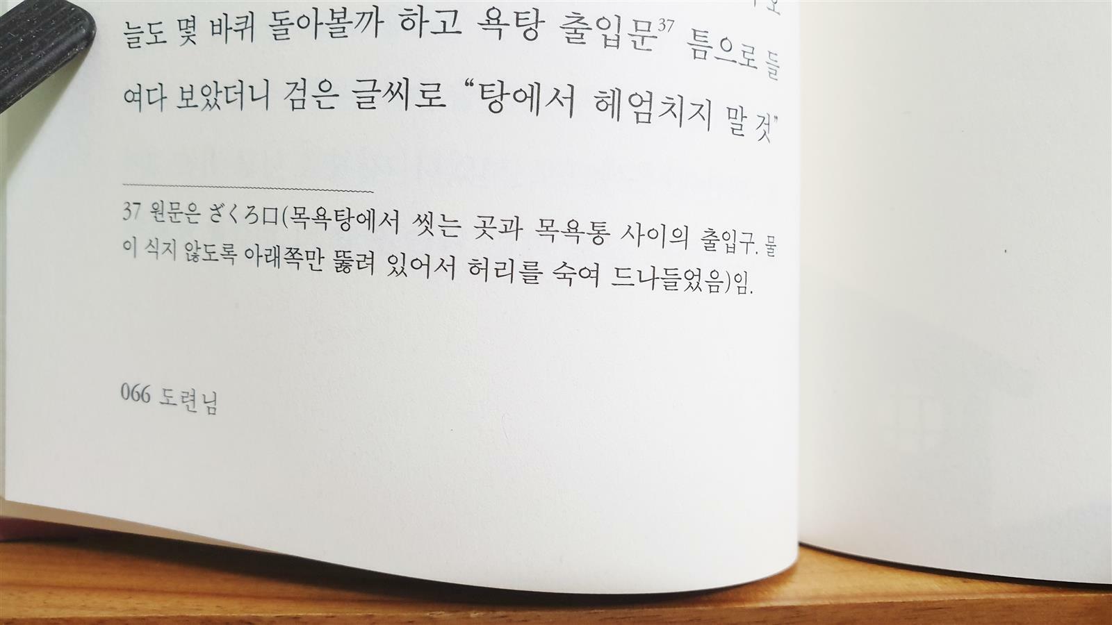 페이지 곳곳에 이런 식으로 각주가 달려 있다. 번역가는 우리가 작품을 이해하기 쉽도록 쉬운 낱말로 풀이해 썼는데, 보다 깊은 이해를 위해 원문의 단어를 각주에 실어놓았다. 작품을 읽는 데에 약간 거슬릴 수 있지만, 이를 통해 일본 근대의 모습을 짐작해볼 수 있고, 우리말로 번역된 문장을 원문의 내용에 가깝게 이해할 수 있으니 좋다.
