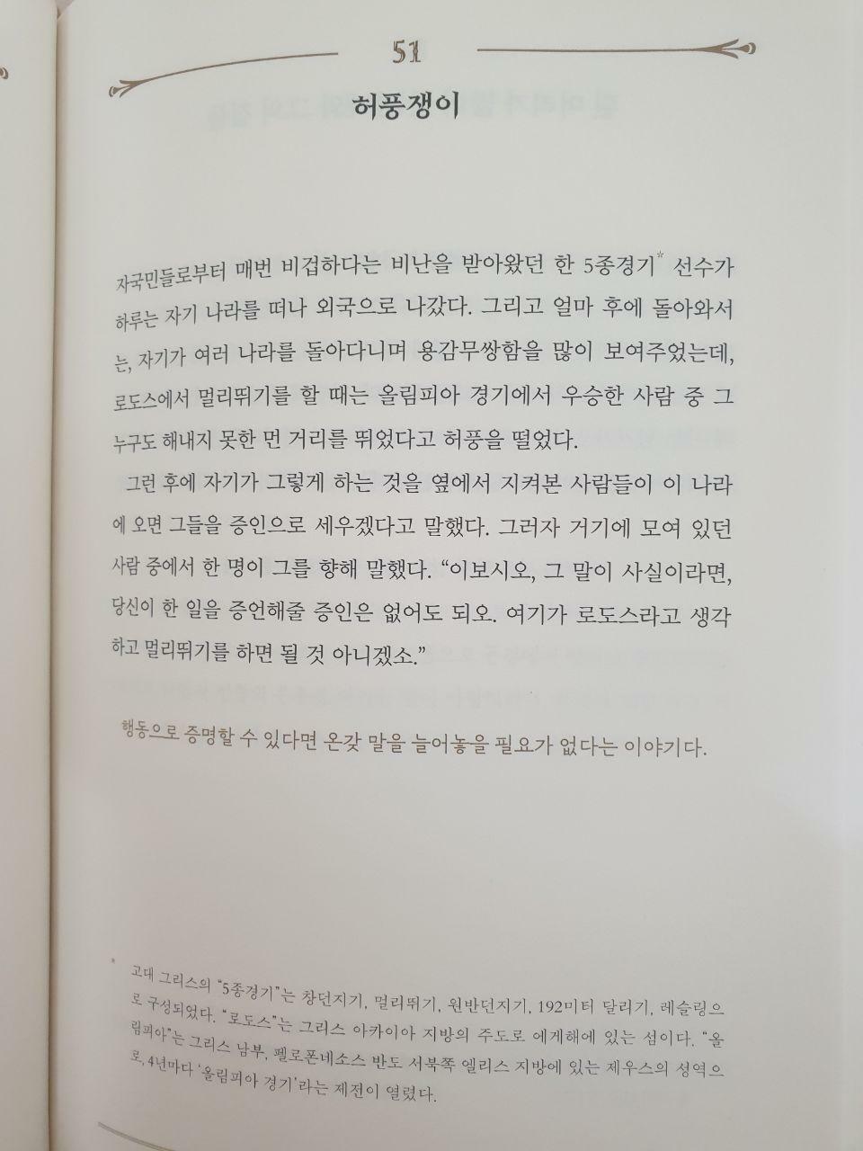 우화의 내용은 단순하다. 이 책에 실려 있는 건 길어봤자 2쪽이고 대부분 1쪽이다. 그마저도 꽉 채우지 못 해 여백이 많다. 그런데 이렇게 짧은 이야기에서도 교훈을 얻을 수 있다. 각 이야기마다 교훈이 적혀 있는데, 역자가 쓴 게 아니라 이솝 우화를 읽은 후대 사람들이 쓴 것이라고 한다. 지금 시대와 맞지 않는 교훈도 더러 있지만 이를 통해서 당시 사람들의 가치관을 짐작할 수 있다.