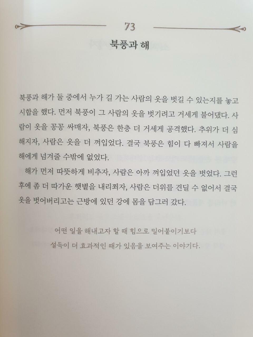 '햇볕 정책'으로도 유명한 그 이야기다. 나그네의 옷을 벗긴 건 매서운 북풍이 아니라 따뜻한 해였다는 이야기. 이 이야기를 통해 때론 유화적인 대응이 더 효과적일 수 있다는 교훈을 얻을 수 있다. 그리고 이러한 교훈은 각종 인간관계에 적용할 수 있을 것이다.