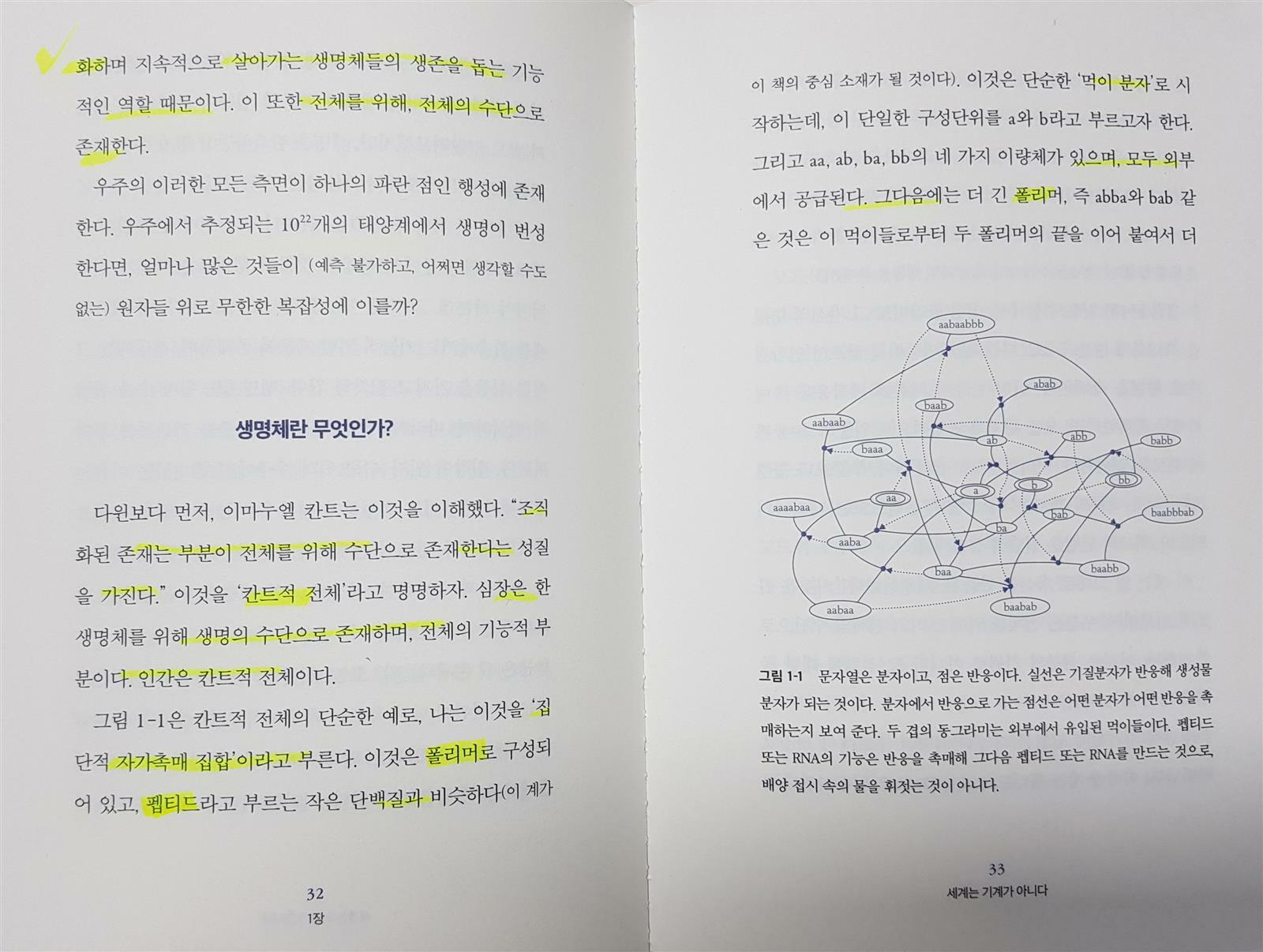 이어 조금은 어려운 용어인 조직화, 제약 회로, 일(work), 경계조건, 엔트로피, 제약 일 순환(constraint work cycle), 일 과제(work task), 자유도, 비전달적인 일과 전달적인 일, 자기 재생산, 과정의 조직화 전파 등등을 언급하며 생명의 세계는 진정으로 부글거리며 앞으로 나아간다고 얘기한다.