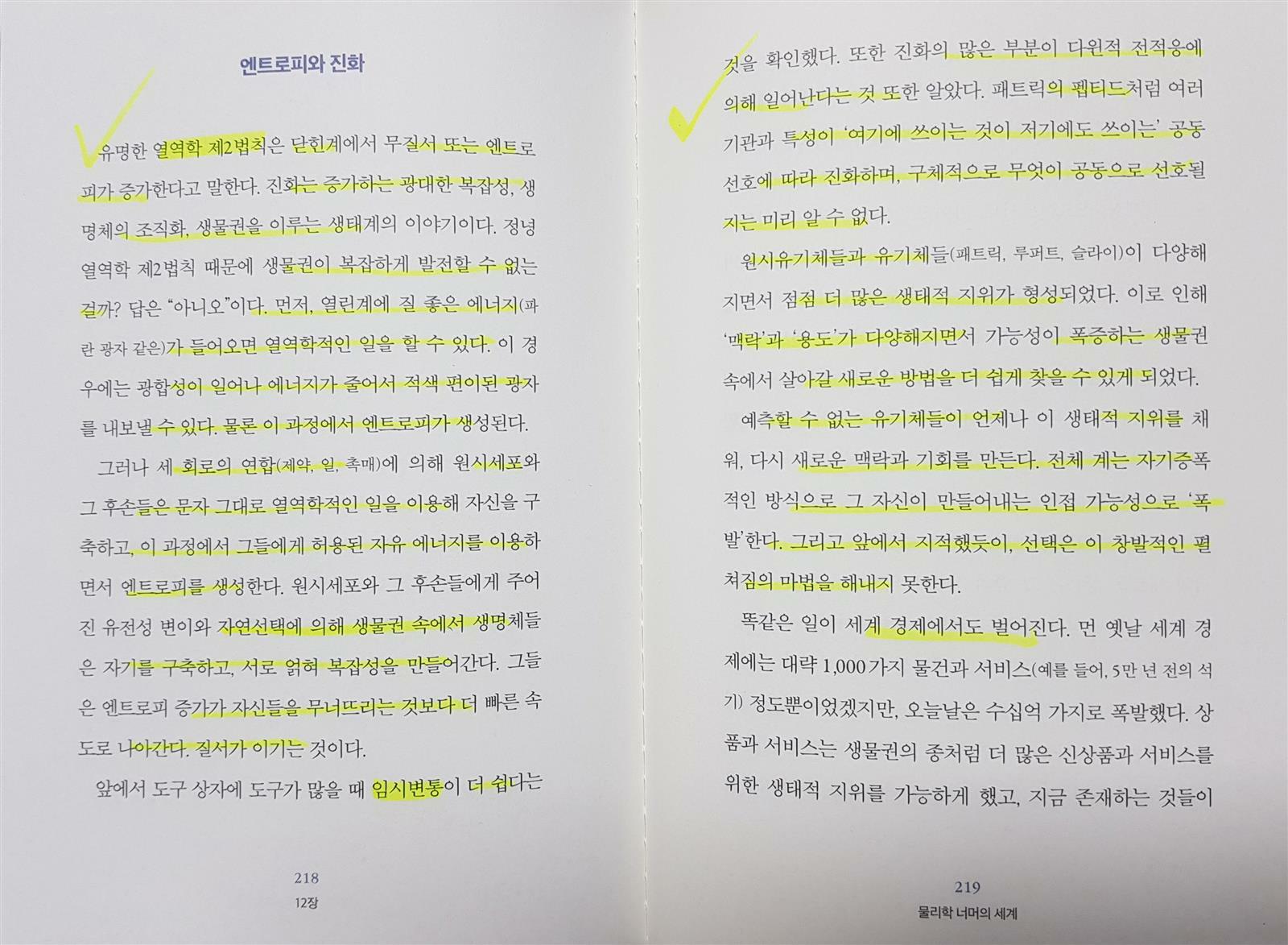 ‘생명의 세계는 기계가 아니다. 뉴턴의 법칙과 더불어 모든 입자의 위치와 운동량으로 세계 전체를 계산할 수 있는 라플라스의 악마가 연역해 낼 수 없는 영역이다. 생물권은 우주의 일부다. 그리고 생명은 세 회로(제약, 일, 촉매) 덕분에 문자 그대로 위쪽으로, 즉 태양을 향해 가지를 뻗는 나무를 만든다. 생명은 다윈이 말한, 자연의 들판에 생기는 틈새에 맞춰 자기를 뜯어고친다. 자연 속에서 생명은 언어로 표현할 수 없는 창의성을 한 번에 폭발시켜 자기 자신을 창조해 간다. 패트릭에서 시작해 미생물 세계로, 진핵생물 세계로, 동물과 식물의 세계로, 다윈의 “가장 아름다운 형태”가 나타났다. 이 광대한 창발의 펼쳐짐은 물리학을 넘어서지만, 여전히 물리학을 바탕으로 한다. 생명은 자기를 창조하며, 방대한 진화적 다양성을 확보한다. 생명은 물리학 너머에 있으며, 증가하는 창발과 복잡성 덕분에 진화하는 우주 속에서 물리학만큼이나 거대하다고 할 수 있다.’