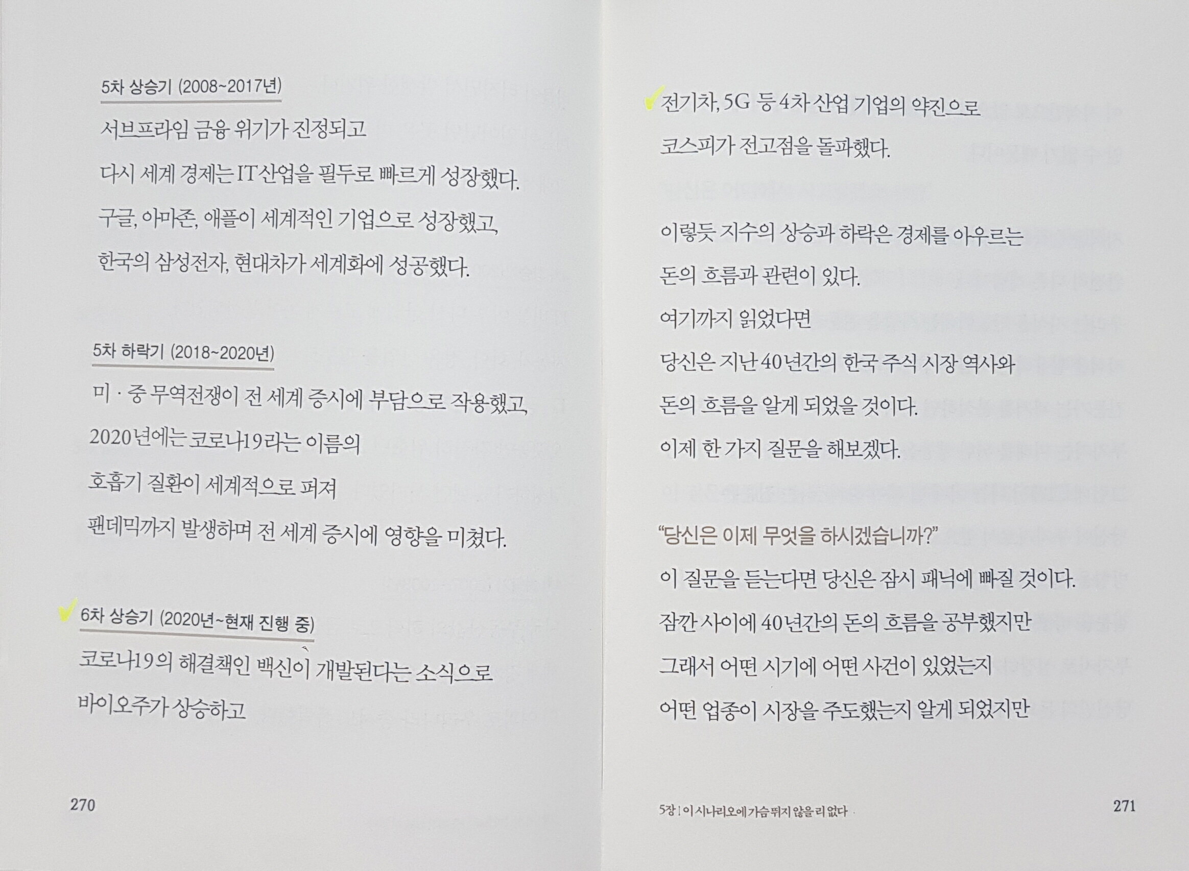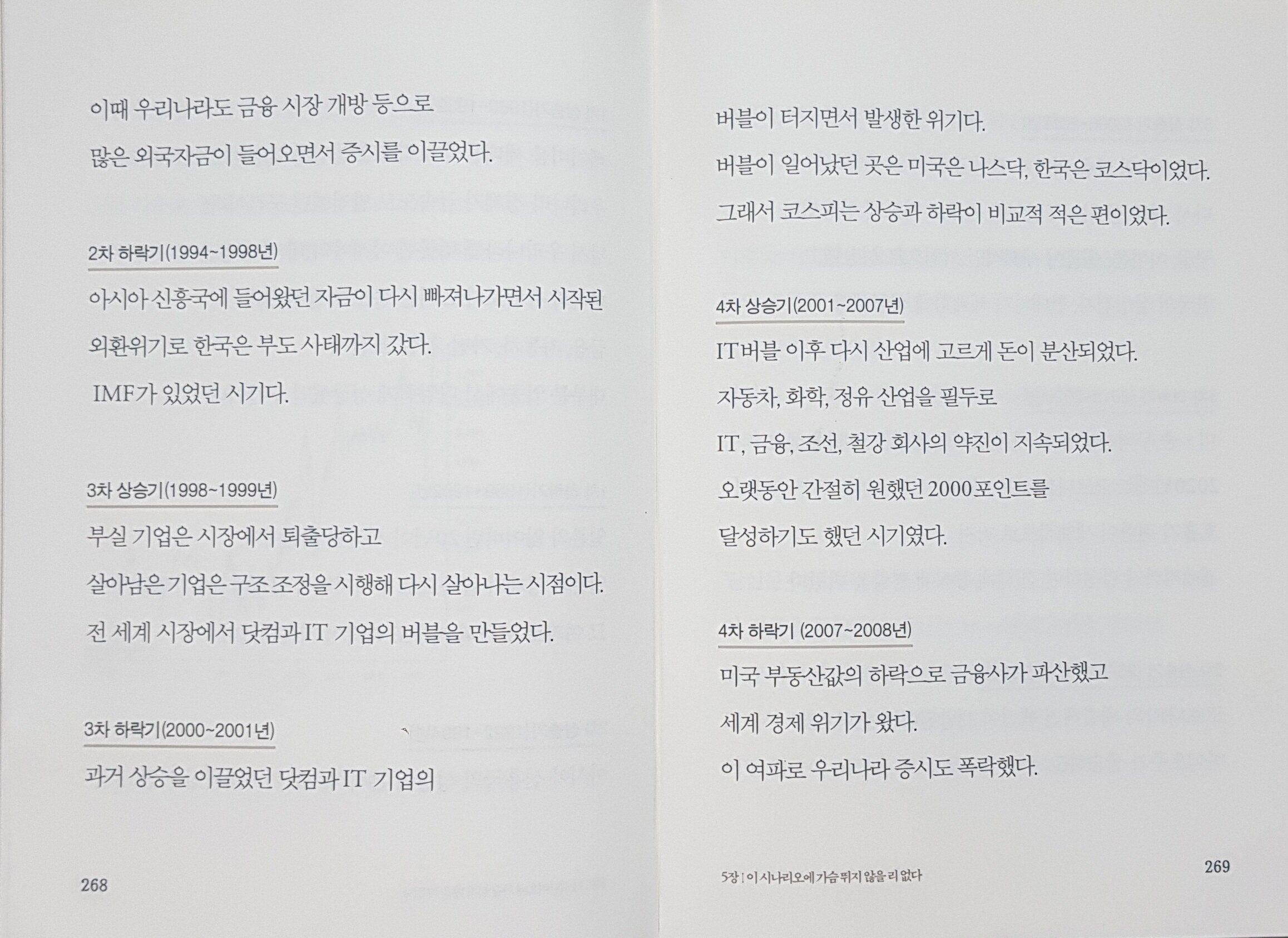 2장_ 영원한 돈을 만들어줄 이름, 지수: 시나리오를 만들어주는 단 하나의 만능키에서는 돈의 시나리오를 쓰기 위해 당신이 반드시 공부해야 할 것이 있다면서 저자는 ‘지수’를 제안한다. 그 이유로 ① 지수는 경제의 거울이다 ② 지수는 차별하지 않는다 ③ 지수는 정확하고 정직하다 ④ 돈의 미래를 보여주는 가장 확실한 이정표 등의 글꼭지를 통해서 다음과 같이 설명해 나간다. 한 나라 경제의 최종 결과값인 지수는 실질적인 경기를 선행해서 대변하면서도, 손쉽게 접할 수 있기에 누구에게나 공평하며 구체적인 숫자로 파악할 수 있어 시나리오에 필요한 최고의 재료가 될 수 있다면서 말이다. 게다가 지수를 공부하면 투자의 역사를 읽을 수 있고, 어떻게 사이클이 반복되는지, 지금 우리는 이 사이클의 어디쯤 와 있는지를 가늠할 수 있게 된다고. 또 호황에는 불황을 준비할 수 있게 하고 위기의 시기에는 기회를 엿볼 수 있게 한다면서 저자는 전문가가 아닌 투자자이기에 복잡하고 어려운 용어보다는 쉽게 이해할 수 있는 수준으로 정말 쉽게 예를 들어가면서 설명하고 있다.